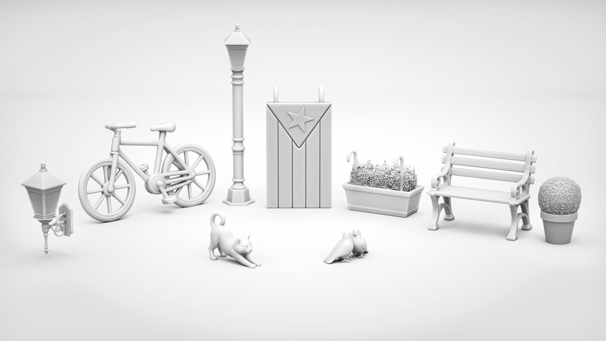 Old San Juan Mini Accessories Set – includes lampposts, benches, plants, bicycles, animals, and more to bring your scene to life.